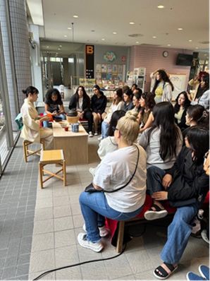 米国カリフォルニア州立ポリテクニック大学ポモナ校(CalPolyPomona)短期留学生27名との交流茶席をセンターホールにて開催いたしました。茶道部からは11名が参加し、立礼卓による呈茶とその解説にて茶の湯の世界をお伝えしました。その後は、亭主と客を反転させて、留学生全員が、茶道部学生や留学生同士のために薄茶を点てるという体験へと繋げました。
