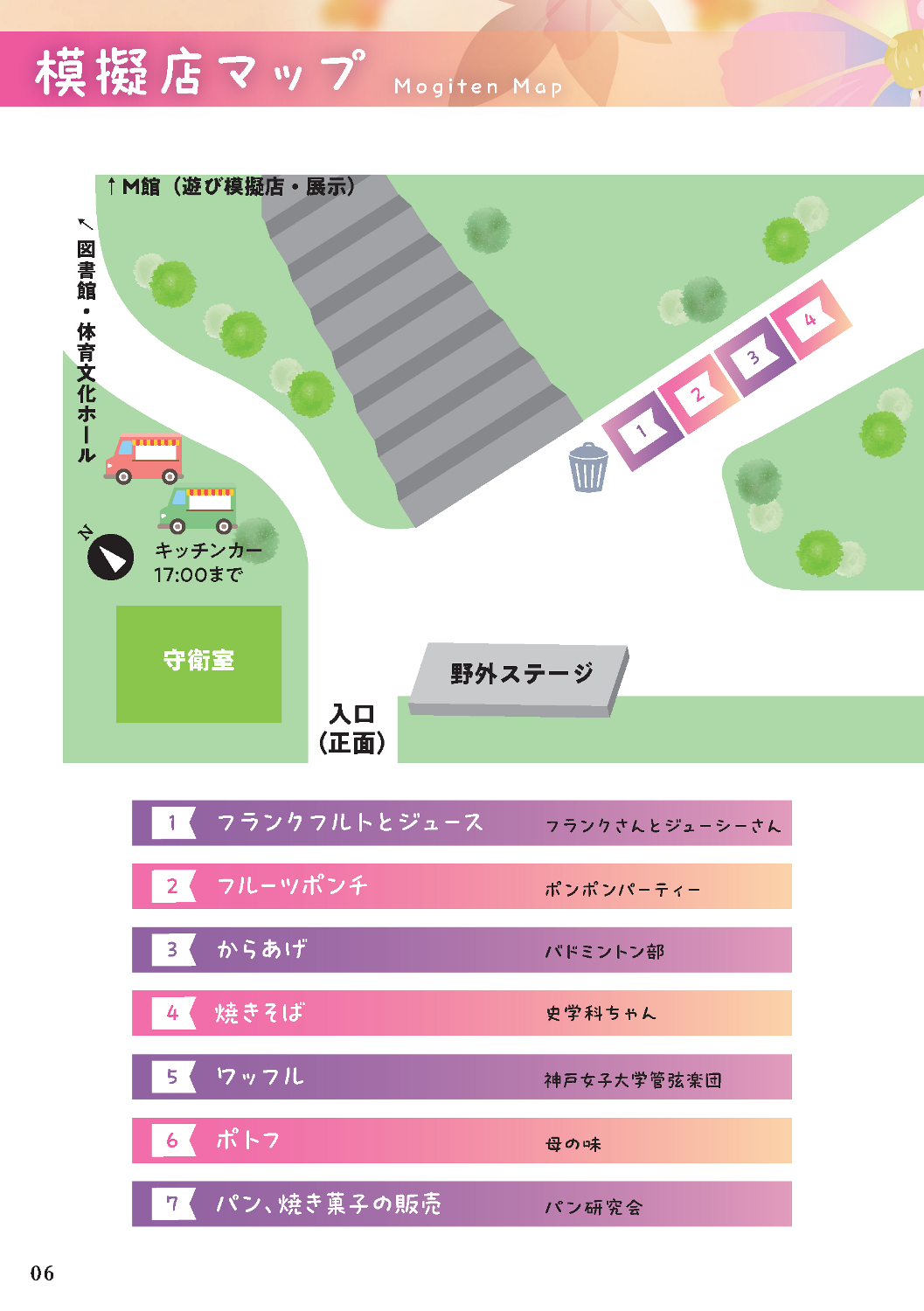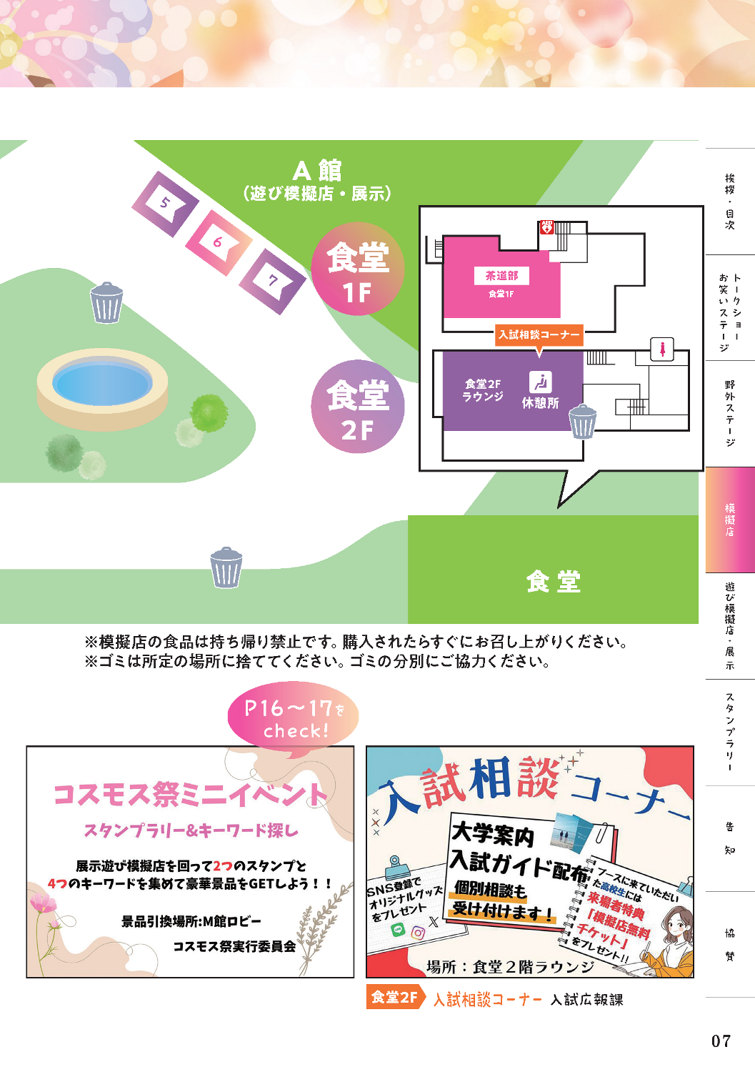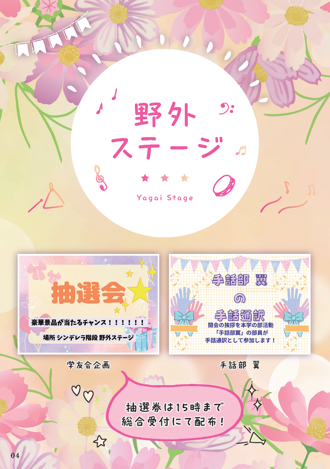イベントメニュー:野外ステージ、トークショー、お笑いライブ、学内展示、模擬店、館内イベントなど