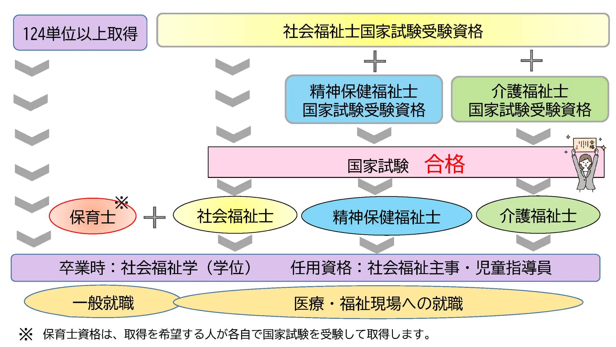 人々の生活に関わる相談支援の専門職として、必要な価値・知識・技術を学び、社会福祉分野で実践力が発揮できる[社会福祉士]を育成します。
