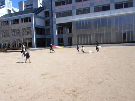 みんなが凧を作り終えたら、グランドに行って凧あげです。自分が作った凧を手にお友だちや学生と一緒に走り回りました。風が吹いて、とても寒かったのですが、おかげで凧は風に乗ってよく上がりました。