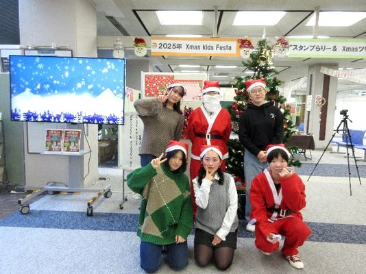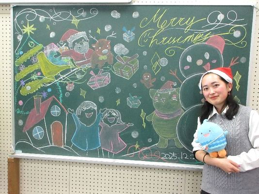 2025年12月20日(土曜日) 神戸市営地下鉄名谷駅から北へ徒歩7分のところにある「神戸市立北須磨文化センター」において「X‘mas Kids Festa 2025」が開催されました。3歳から小学生までのこどもたちと保護者を対象に「スタンプ・ラリー」・「クリスマスツリーオーナメント」・「黒板アート&イラスト」等のイベントがあり、イラスト部の学生6名が企画・運営を進めてきた「黒板アート&イラスト」を担当しました。