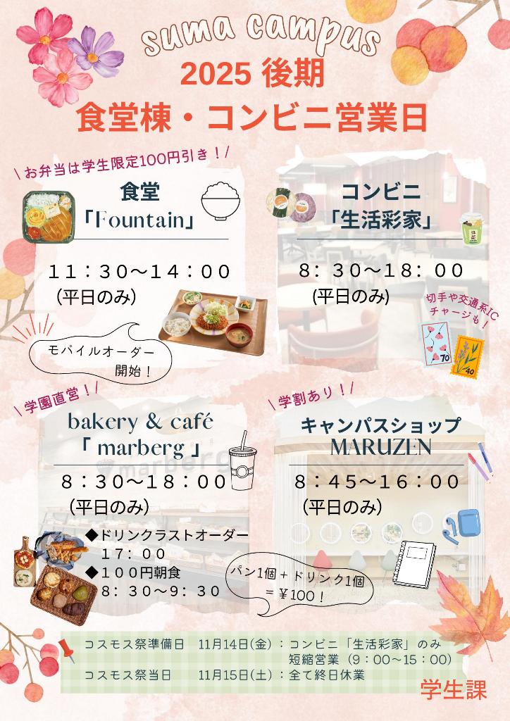 須磨キャンパス・ポートアイランドキャンパス食堂・売店・マーベル(bakery & café)後期営業日(9月26日~)についてのお知らせです。各自、営業日を確認の上、ご利用ください。