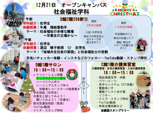 そして、高校3年生の皆様には、入試や神女の学生生活のイメージを膨らませていただけるように、高校1・2年生の皆様には、神女の社会福祉のイメージを膨らまていただけるように準備を進めています。詳細は、オープンキャンパスのチラシをご覧ください。