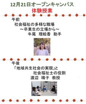12月21日の体験授業は、本学の卒業生で現在は本学の助手として勤務している卒業生が、病院のソーシャルワーカー、公務員としての福祉職の経験を体験授業としてお話しします。午前中に体験授業をした後は、「卒業生と話してみよう!聞いてみよう!」コーナーにて、高校生の皆様からの質問を受け付けています。午後の体験授業は、「地域共生社会の実現」と社会福祉士の役割の予定です。