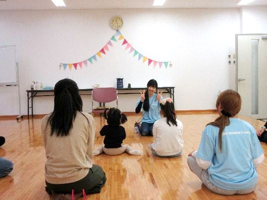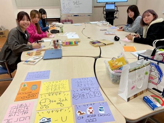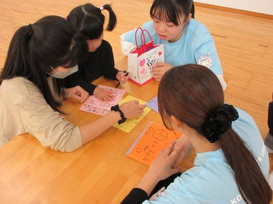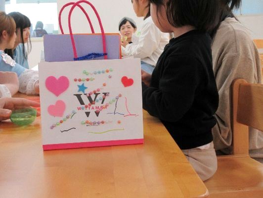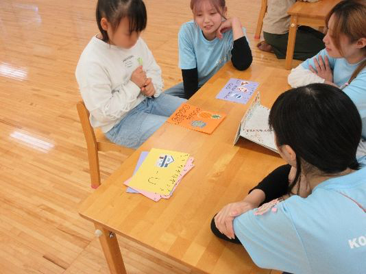授業で謎解きを考えて、袋の試作品を作りました当日は、まず初めに「なべなべ底抜け」のふれあい遊びをしました。はじめは子どもとお母さんがペアになって「返りましょ」の歌詞に合わせて背中合わせになり、次の「返りましょ」で元の向かい合わせになりました。次は、学生も入って大きな円になって、「返りましょ」で大きな後ろ向きの円になり、次の「返りましょ」で元の円に戻りました。