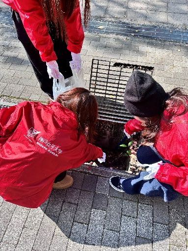 天気も良く、「大学の周りにこんなところあるの知らなかった~」とか、「タバコのポイ捨てないわ~」とか、わきあいあいお話ししながら、みんなで一生懸命清掃活動を行いました。
