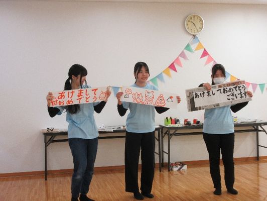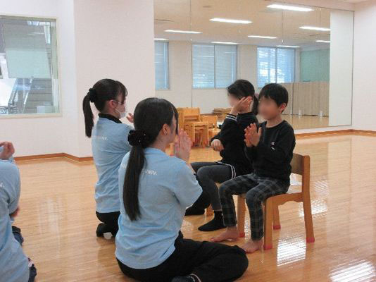書初めの後は、子どもと学生がペアになって「アルプス一万尺」の手遊びをしました。