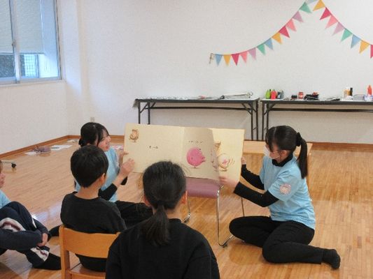 続いて学生が「おしくらまんじゅう」の絵本を読み、特別に先生が「めっきらもっきら どおん どん」の絵本を読みました。子どもたちは絵本に吸い寄せられるように見入っていました。