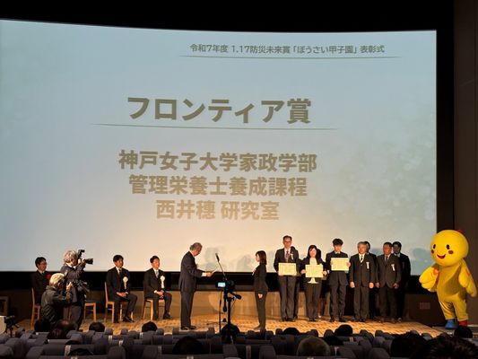 1月24日、人と防災未来センター(神戸市中央区)で開かれた「ぼうさい甲子園(1・17防災未来賞)」(実施主体 兵庫県、毎日新聞社、ひょうご震災記念21世紀研究機構)の表彰式において、家政学部管理栄養士養成課程 西井研究室が「フロンティア賞」を受賞しました。