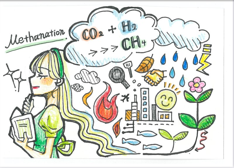地球温暖化対策の1つであるメタネーションという技術について取り上げています。発電所や工場などから回収した二酸化炭素を利用してメタンをつくるこの技術を使えば、大気中の二酸化炭素が増えないといわれています。