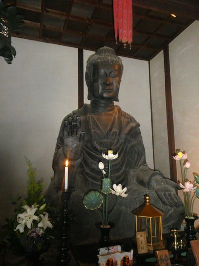 飛鳥寺跡(安居院)飛鳥に入り、まず飛鳥寺跡を訪れました。飛鳥寺は法興寺とも呼ばれ、蘇我馬子が造営しました。現在は、真言宗の安居院になっています。本尊は、609年に鞍作鳥が制作したとされる釈迦如来坐像で、飛鳥大仏ともよばれます。住職から飛鳥寺や飛鳥大仏の由来を丁寧に説明していただきました。昭和31年(1956)の発掘調査の際の出土遺物が堂内に展示されています。安居院の西門の外に、蘇我入鹿の首塚と伝えられる、南北朝時代の五輪塔があります。