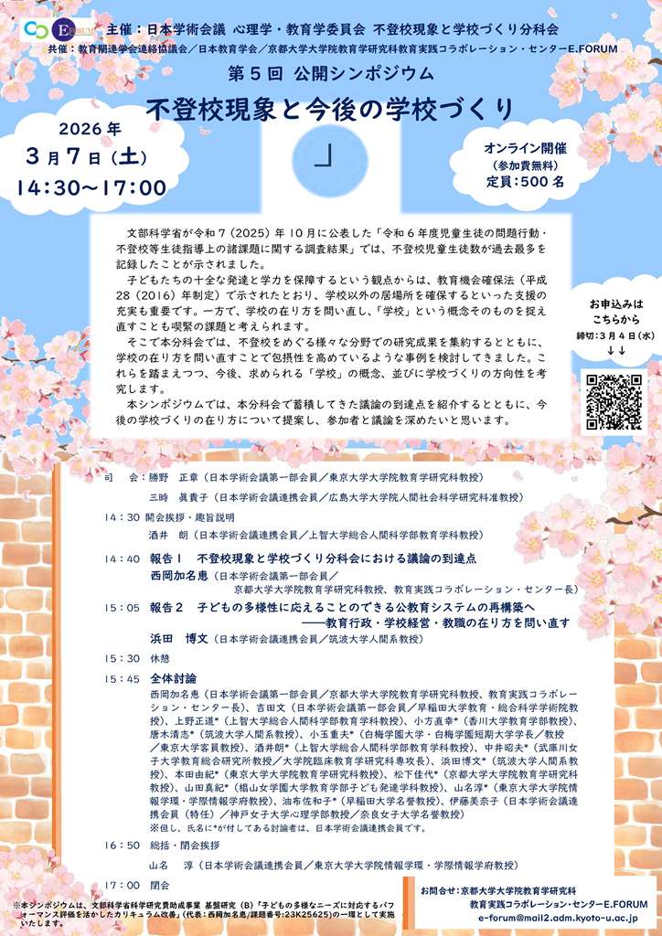 伊藤 美奈子教授が3月7日(土)に開催される日本学術会議 心理学・教育学委員会 不登校現象と学校づくり文化会主催の第5回 公開シンポジウム「不登校現象と今後の学校づくり」の全体討論に参加します。