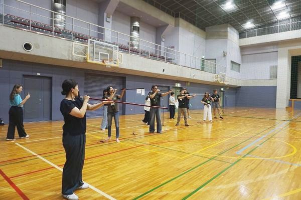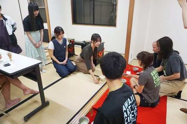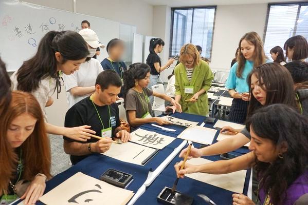 交流会の後は、書道部、茶道部、スポーツウエルネス吹矢部の協力による日本文化体験でした。パフォーマーの皆さんは、各クラブ活動に参加している学生のサポートを受けながら日本文化に触れました。初めて筆を持って漢字を書き、静かなお茶席のたたずまいでお茶をいただくという伝統文化からスポーツウエルネス吹矢という比較的新しいスポーツまで、パフォーマーの皆さんに喜んでいただけたようでした。
